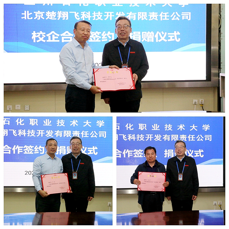 仪式上,陈正武首先代表学校对杰出校友赵华江一行表示热烈欢迎,对校友们长期以来关心和支持学校教育事业发展表示衷心感谢。他指出,校友是学校建设和发展的重要资源,学校的发展离不开一批又一批石化人薪火相传的接续奋斗,离不开广大校友的倾力支持。赵华江继2018年向母校捐赠价值200万元的教学仪器设备,2020年3月和2021年10月两次捐赠防疫物资后,在学校大力推动高质量发展的关键时期,今年又主动联系学校,再次慷慨捐赠200万元的教学仪器设备,助力学校教育事业发展,体现了赵华江先生的社会责任感和社会担当,践行了企业家为中华民族伟大复兴贡献自己力量的使命。此次捐赠既展现了校友们对母校的真挚情感,也是学校人才培养成果最直观生动的体现,更蕴含着广大校友对学校事业不断向前的更高期待。今后学校将进一步加大与校友沟通联络力度,用心、用情做好校友的服务工作,积极对接校友所在企业,深化校企双方在科学研究、成果转化、人才培养、职工培训等方面合作,实现相关资源共享,共同打造校企合作、校友合作的新样板、新典范。